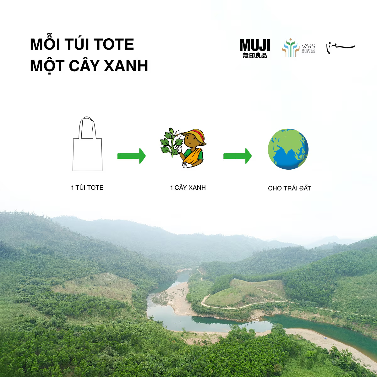 Với mỗi chiếc túi tote được bán ra, MUJI Việt Nam sẽ trồng một cây tại miền Trung Việt Nam thông qua dự án “Trồng và Phục hồi Rừng đầu nguồn Sông Gianh” của VARS. Cùng với sự chung tay của khách hàng, MUJI và các đối tác đặt mục tiêu trồng thêm 4000 cây xanh trong dự án này.