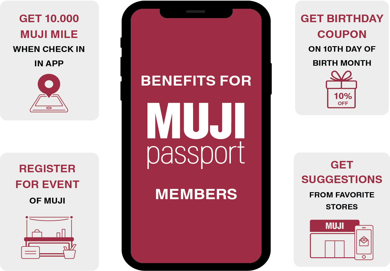 You will receive discount coupons on the MUJI passport on your birth month or the MUJI Passport Reward incentive program during the year. Particularly, when you become a MUJI passport member, you will also have chances to receive other special discount coupons throughout the year.